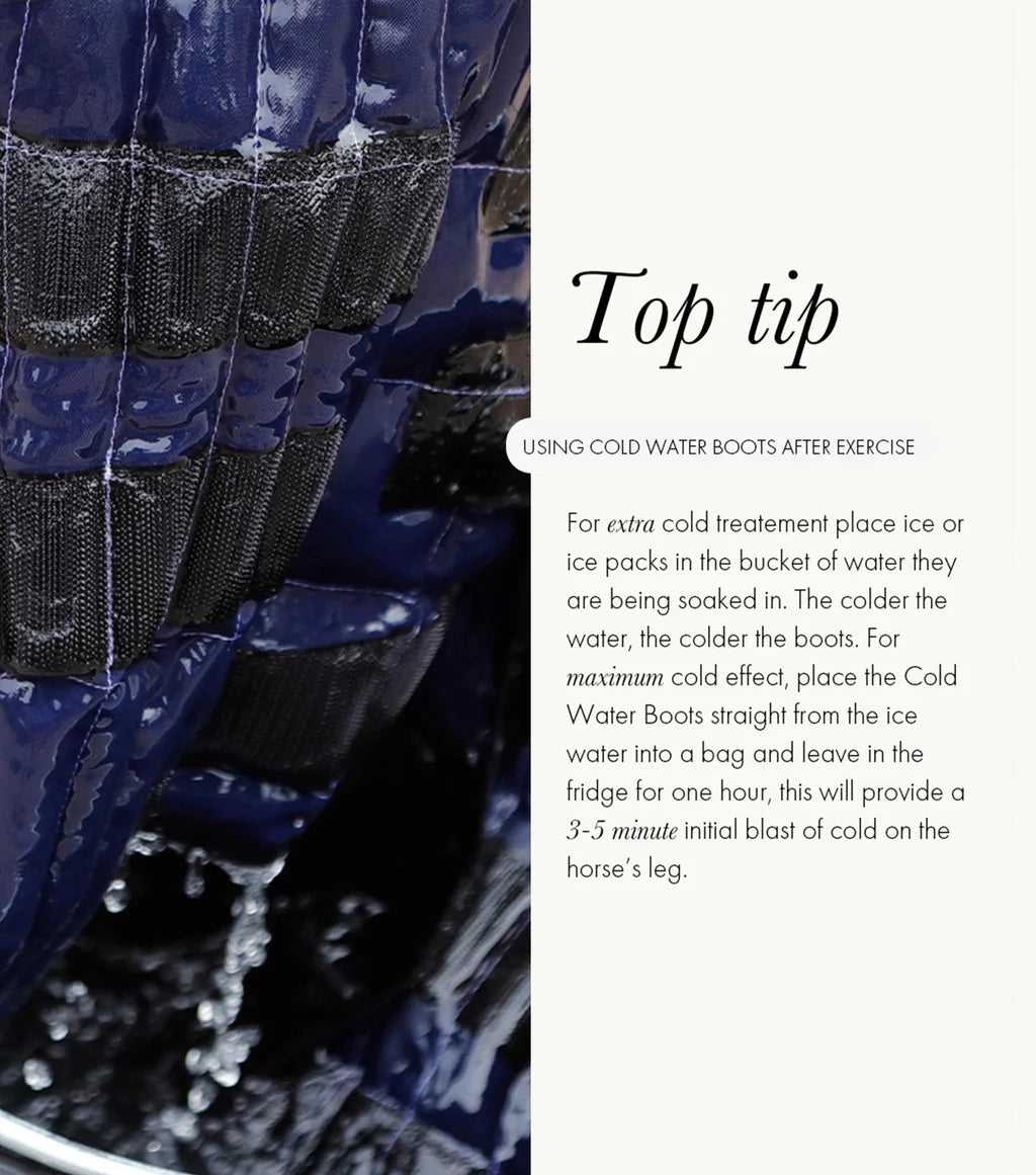 After hard work the Cold Water Boots should be applied for around 20 minutes. For extra cold treatment place ice or ice packs in the bucket of water that they are being soaked in. The colder the water, the colder the boots. For a maximum cold effect, place the Cold Water Boots straight from the ice water into a bag and leave in the fridge for one hour, this will provide a 3-5 minute initial blast of cold on the horse's leg. Never freeze Cold Water Boots.