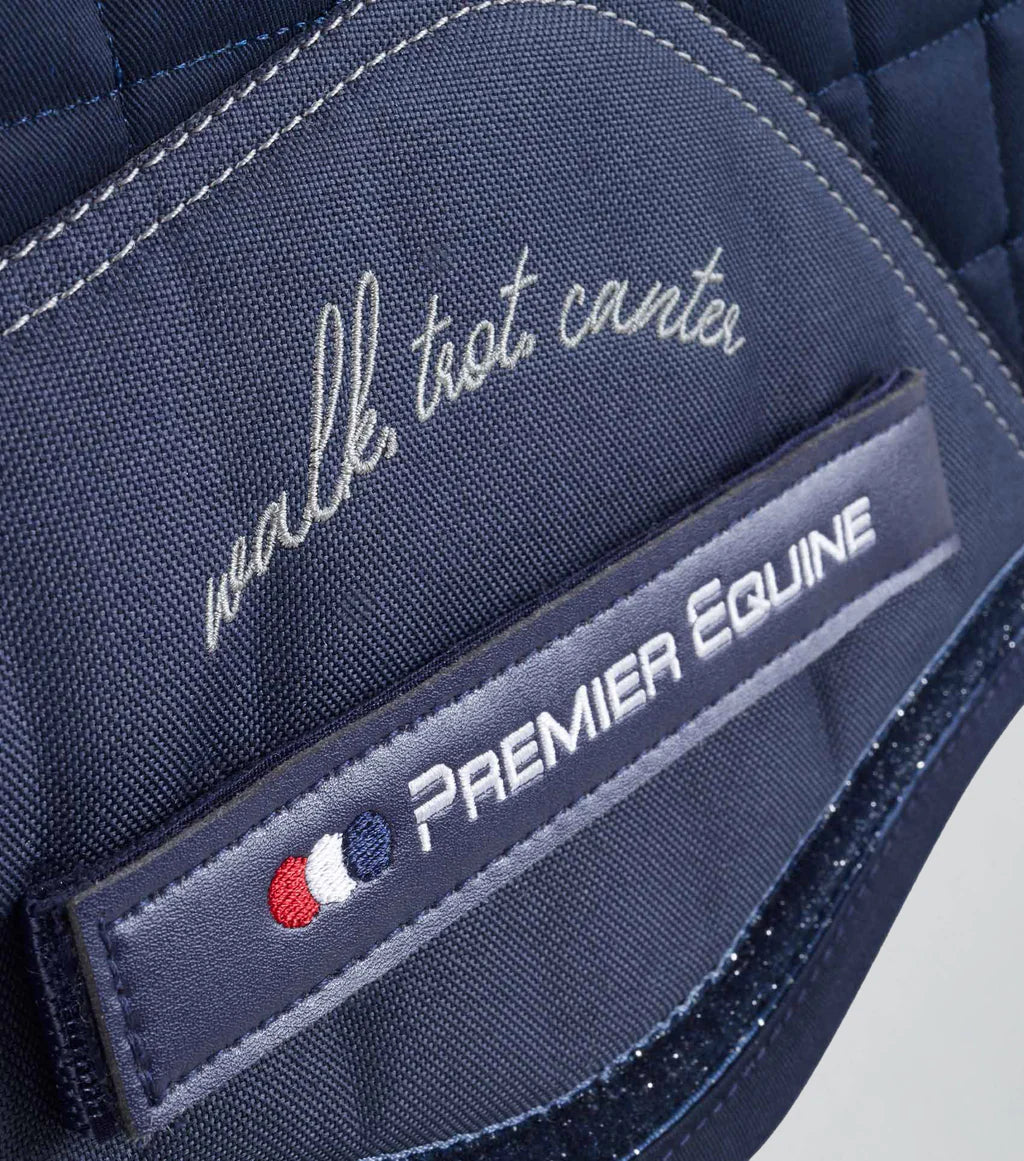 Designed to dazzle this fun GP/Jump pony saddle pad features glitter around the inner binding edge and two contrasting glitter stripes on a navy satin panel towards the rear of the pad to make the colour palette of this pad ‘pop’.