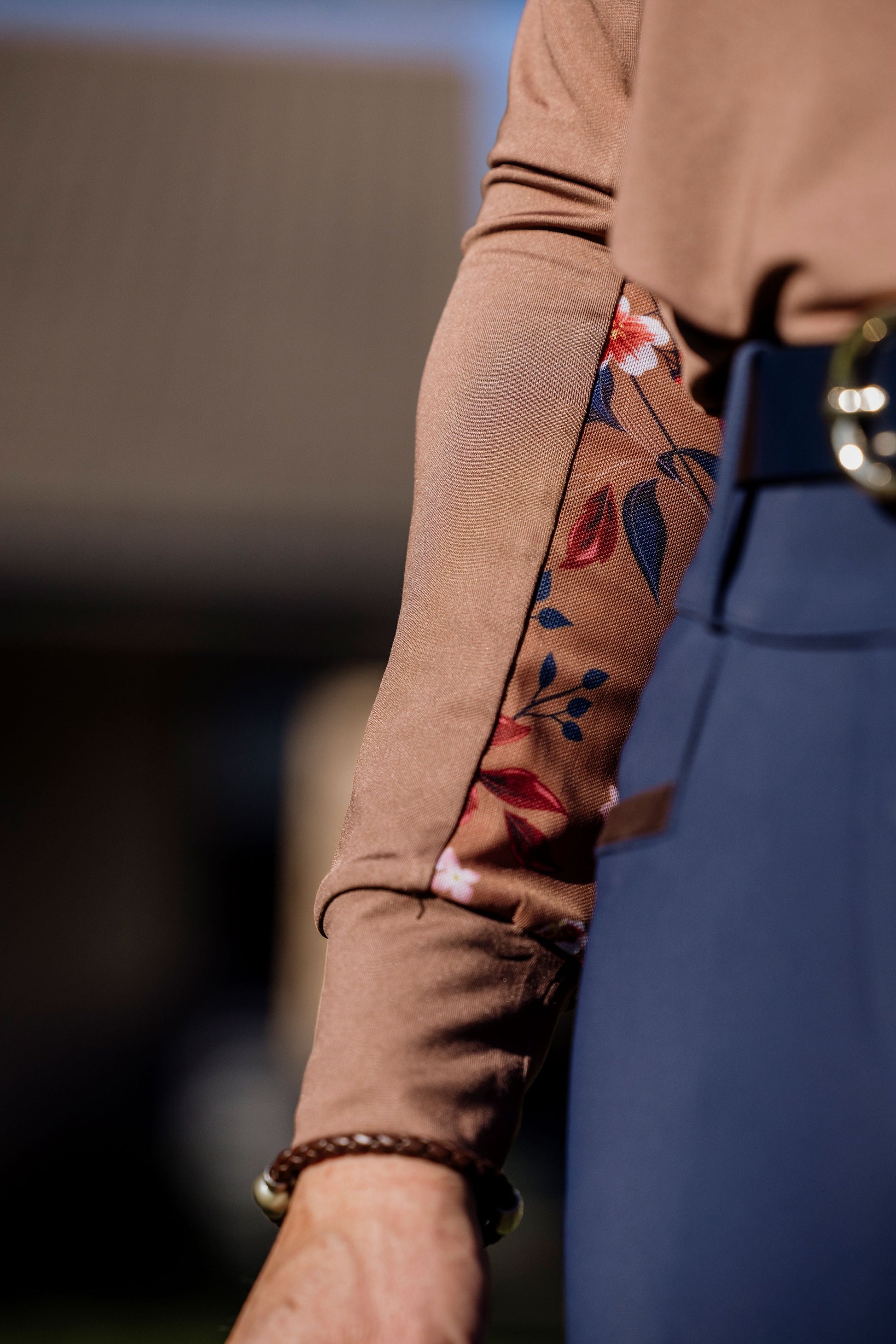 Our Walnut 1/4 Floral Base Layer. Featuring 3 Mesh panels across the back and under the arms to ensure optimal airflow to keep you cool while looking after your skin from the sun.